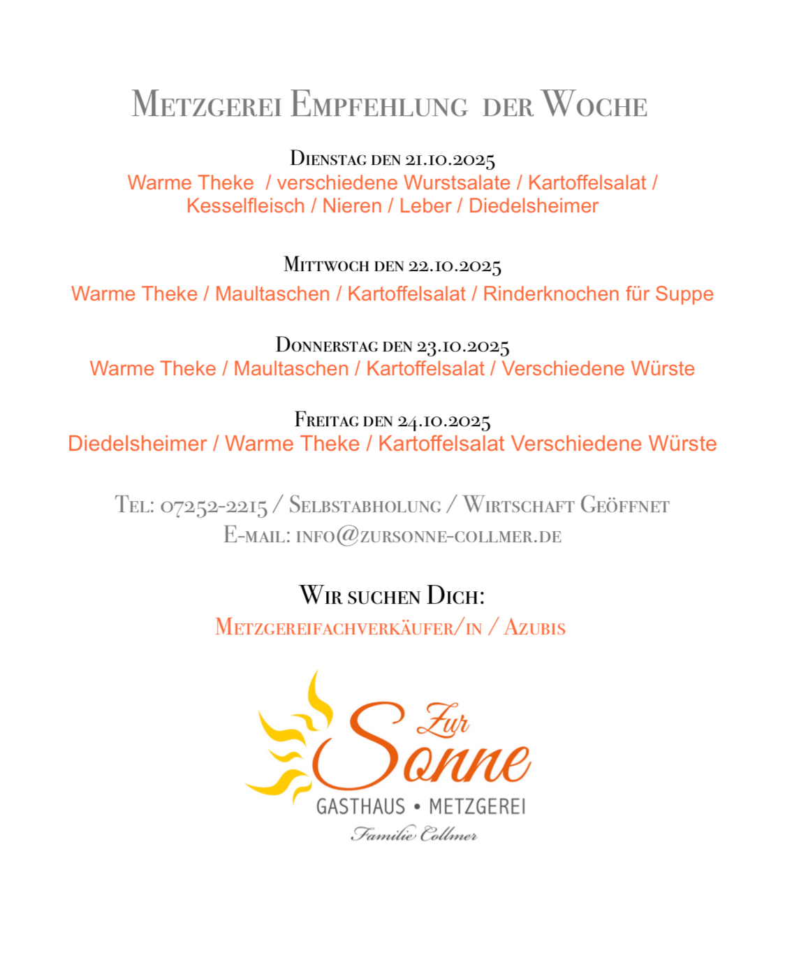 Unsere Metzgerei präsentiert Ihnen feinste Fleisch- und Wurstwaren, die aus eigener Schlachtung stammen und von Schweinen aus der näheren Umgebung bezogen werden. Täglich verwöhnen wir Sie zudem mit frisch gebackenen Leckereien aus unserer heißen Theke sowie mit Spezialitäten wie hausgemachten Maultaschen und Kartoffelsalat. Darüber hinaus bieten wir einen Party- und Plattenservice an.