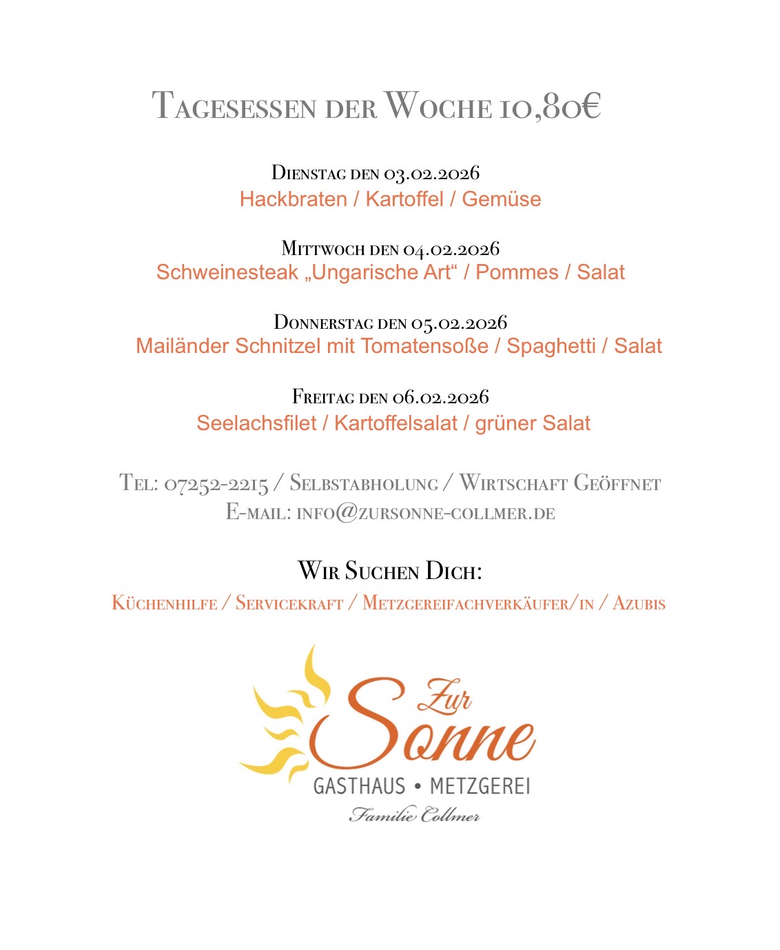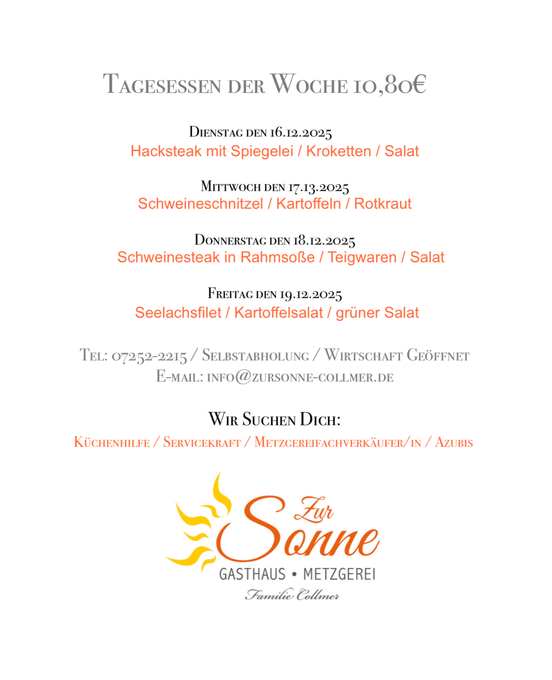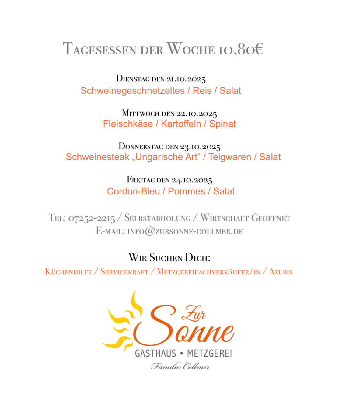 Täglich frisch zubereitete Tagesgerichte, die je nach Saison und Verfügbarkeit regionale Spezialitäten umfassen.