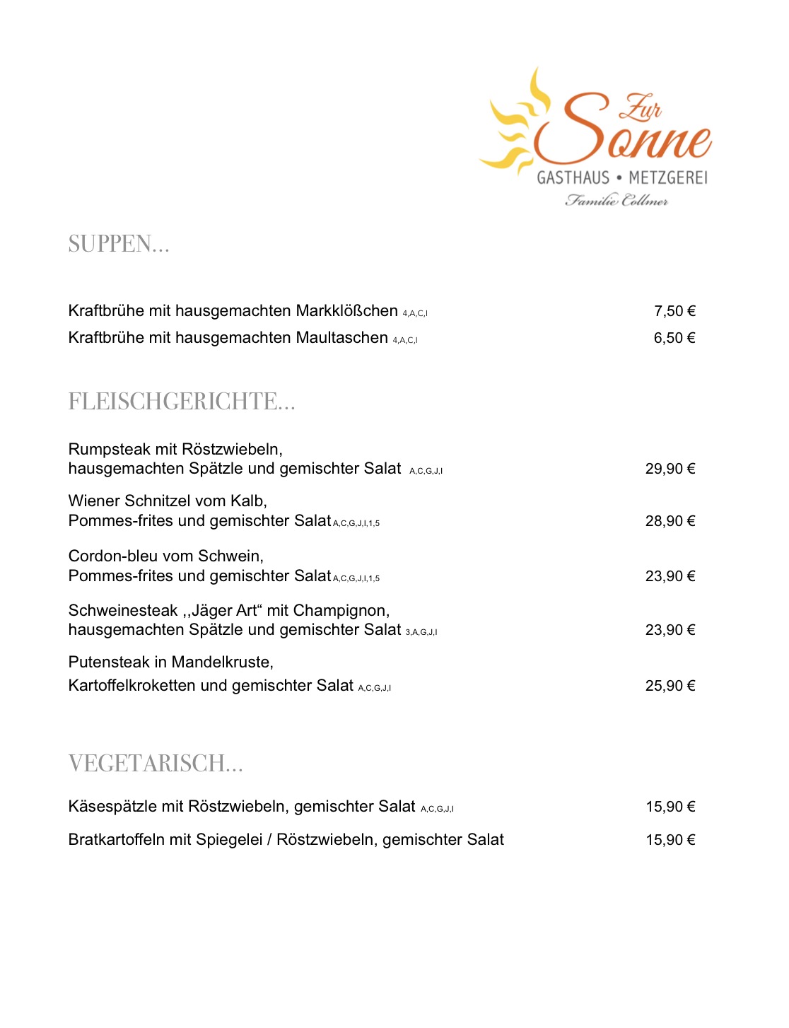 Genießen Sie feinste Gerichte aus eigener Schlachtung sowie regionale Spezialitäten, die nach bewährten Familienrezepten zubereitet werden. Unser Angebot reicht von deftigen Fleischgerichten bis hin zu köstlichen vegetarischen Speisen. Neben unserer täglich wechselnden Tageskarte bieten wir auch eine vielfältige Auswahl an Gerichten à la carte an. In unserem gemütlichen Ambiente, können Sie in geselliger Runde genießen und die traditionelle Gastfreundschaft erleben die bei uns seit Generationen großgeschrieben wird.